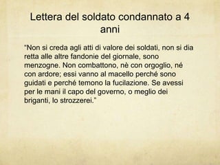 Lettera di un soldato al fronte - Per la pace Ho voluto raccontare, sotto forma di lettera destinata alla madre, la storia di un soldato qualunque al fronte. La battaglia che si sta svolgendo è quella di Caporetto, combattuta durante la Prima Guerra Mondiale. Credo che questa esperienza mi abbia invitata a riflettere, ma anche a provare emozioni fortissime, che ora galoppano dentro di me.