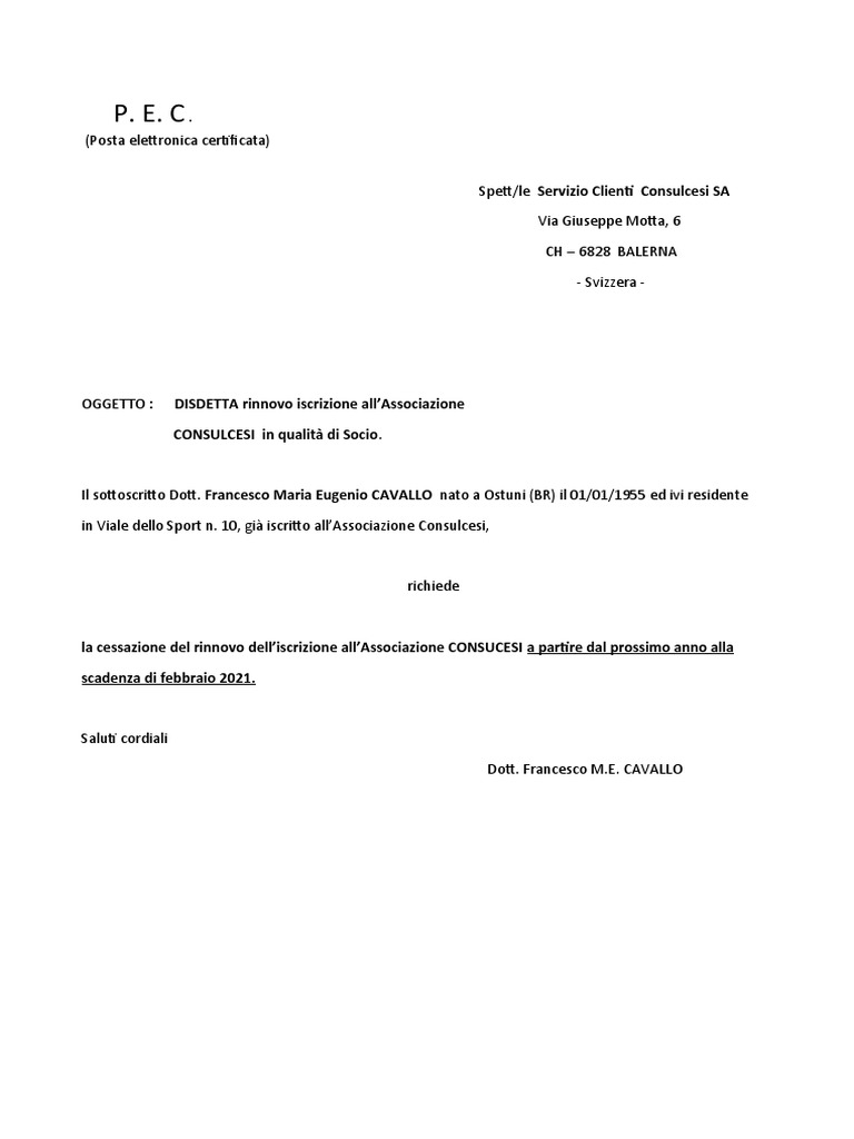 DOC Confconsumatori - Associazione Di Consumatori, Per I Consumatori OGGETTO: disdetta polizza assicurativa intestata a _______ numero______ con scadenza _________ Con la presente si dà formale disdetta della polizza in oggetto per la sua naturale scadenza. Quanto sopra con riferimento sia alle condizioni di polizza che alle norme di legge vigenti. In attesa di ricevere l'attestato di rischio, invio distinti saluti.